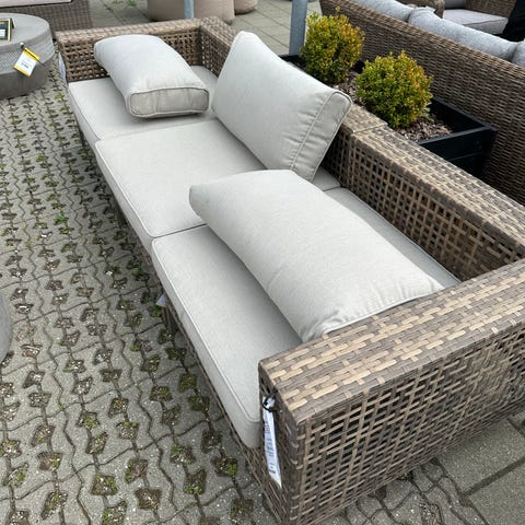 Serino Havemøbelsæt loungesæt i flet med hynder. Sættet består af en 3-personers sofa, en loungestol samt et rundt sofabord.sofa er 250 cm lang