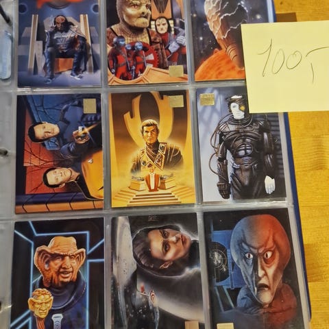 Star Trek Deep Space Nine samlekort. Kortene viser forskellige figurer og scener fra tv-serien, trykt i farver med serienavn og figurnavne på forsiden. Egner sig til samling, opbevaring i mapper eller udstilling for fans af Star Trek-universet. Komplete set ,prisen er fast, Køber betaler forsendelse