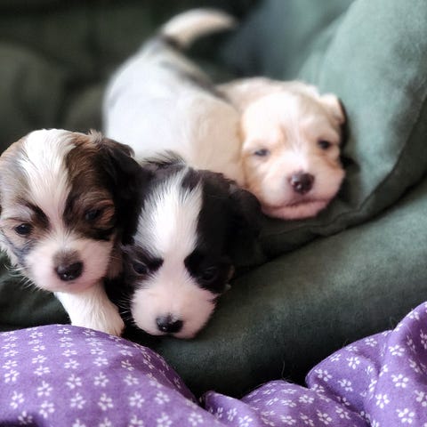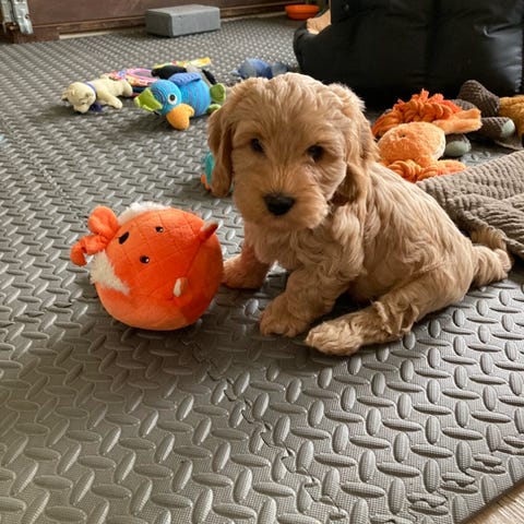 Der med følger et tæppe, lidt hvalpe foder mm.