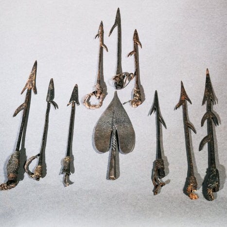 Harpun i ben og træ. Længder ca 190 cm og 150 cm