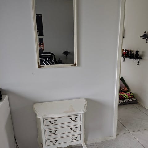 Tungt spejl med kommode med 2 store skuffer og hjørne skab og et flot skab til væggen 😊