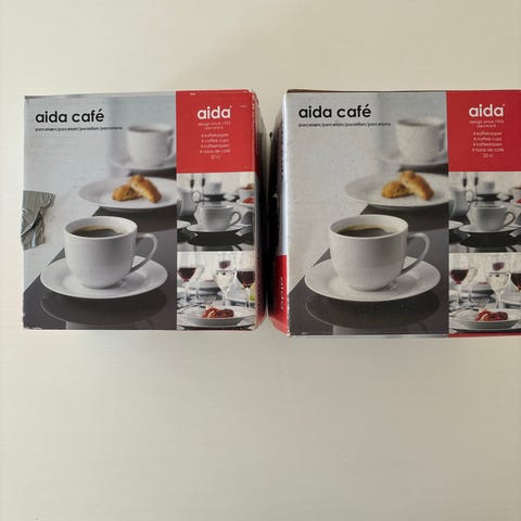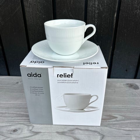 19 aida Relief kaffekop med underkop i hvidt porcelæn. Det fremstår i rigtig god stand uden skår, der kan være brugsridser, men ikke noget man bemærker medmindre man kigger efter dem.