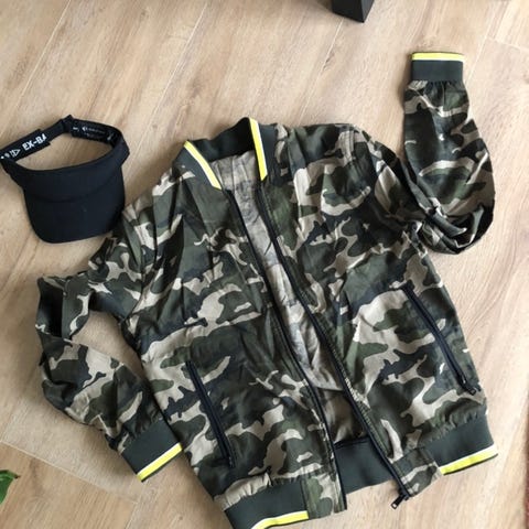 Army grøn. Str M der er god plads i, tænker str. L også kan passe den....