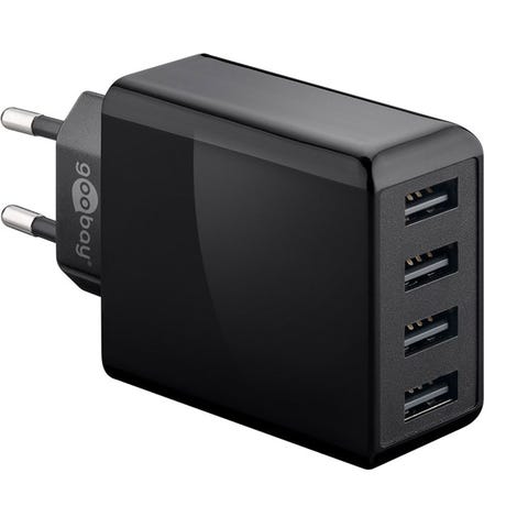 Opladeren tilsluttes direkte i en stikkontakt med europæisk stik (to ben). På forsiden er der fire USB-porte mærket til iPad & iPhone, Galaxy samt to standard-udgange, så flere enheder kan oplades samtidig via USB-kabler.