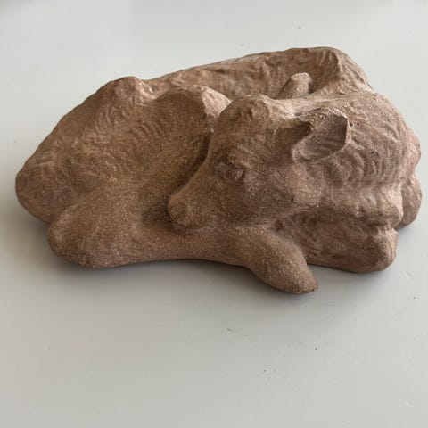 Just Andersen skulptur i sandsten, formet som siddende kvindefigur.