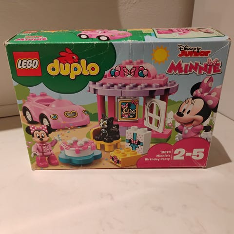 LEGO DUPLO Disney byggesæt med Minnie Mouse figur, lille lyserødt fly og et mindre hus. Sættet indeholder store DUPLO-klodser i flere farver, blandt andet lyserød, blå, gul og grøn. Der medfølger tilbehør som stol, tekande, blomst og klodser med is- og gaveprint. Egnet til små børn, der leger med DUPLO og Disney-figurer.