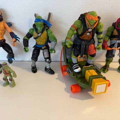 Teenage Mutant Ninja Turtles actionfigurer med tilbehør. Sættet omfatter flere figurer i forskellige størrelser samt diverse våben og udstyr, herunder sværd, stave, kastestjerner og rustningsdele. Figurerne forestiller karakterer fra Teenage Mutant Ninja Turtles-universet og har bevægelige led. Tilbehøret kan kombineres på forskellige måder til leg eller som samlerobjekter.