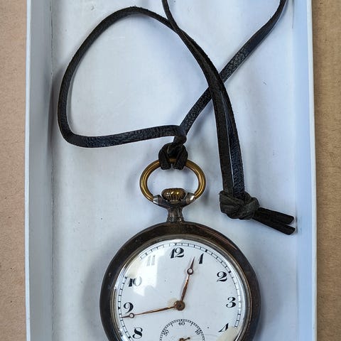 Junghans Shockøproof 17 jewels lommeur med bordstander i messing og træ. Lommeuret har hvid urskive med romertal og småsekundviser. Uret er monteret i en bordstander. Uret fungerer.