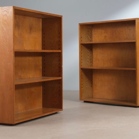 Sæt med to solide reoler udført i mørkbejdset massivt træ med et enkelt og funktionelt udtryk. Reolerne har et klassisk, næsten arkitektonisk design med rene linjer og god dybde, som gør dem velegnede til både opbevaring og udstilling.