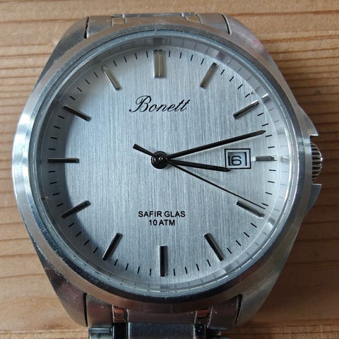 Bonett herreur quartz med batteri isat den 19/3-2026. Uret er vandtæt til 100 meter (ikke testet) og i titanium. Glasset er saffir og derfor uden ridser.