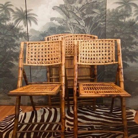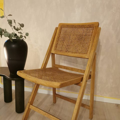 Bambus klapstol i bambus med hvidt lærredsryg- og sæde. Stolen har et sammenklappeligt stel i bambus og aftageligt stof i lys farve. Velegnet som ekstra siddeplads i stue, soveværelse eller på altan/terrasse under tag.. stof trænger til at blive skiftet