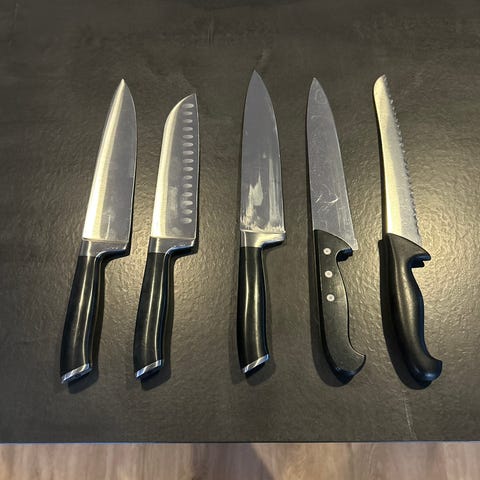 Fire køkkenknive fra Ikea. Knivene er brugte, men er lige blevet slebet med vådsten, så de står fuldkommen knivskarpe.