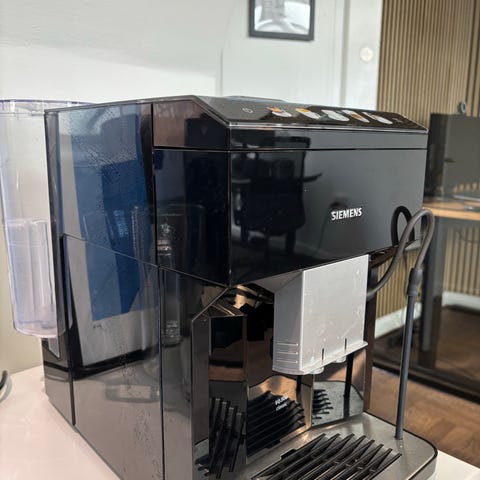Siemens espressomaskine i sort. Fuldt automatisk maskine med betjeningspanel på fronten med valg til forskellige kaffedrikke. Integreret beholder til kaffegrums og vandtank bagtil. Egnet til brug i hjemmet eller på kontor til brygning af espresso, kaffe og andre varme drikke. Designet som fritstående bordmodel i kompakt størrelse.