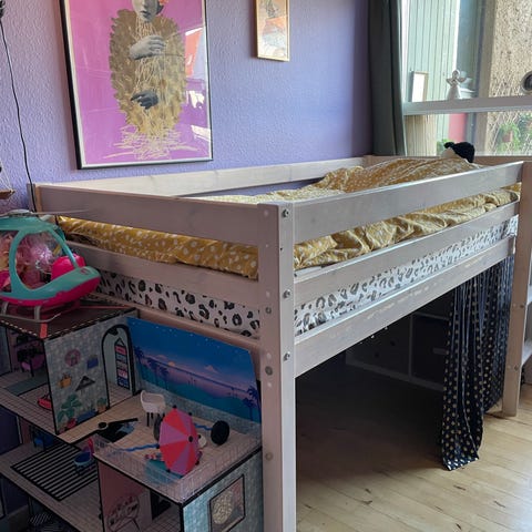 IKEA højseng i hvidlakeret metal. Sengen har liggeflade øverst med sengehest hele vejen rundt samt integreret stige i metal. Konstruktionen er åben under sengen, så der er plads til fx sofa, skrivebord eller madras på gulvet. Egnet til ét barn eller én voksen, afhængigt af mål og vægtgrænse angivet af producenten. Farve: hvid. Materiale: metal.