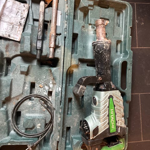 Scheppach nedbrydningshammer med tilhørende mejsler i transportkasse. El-drevet maskine med kabel og håndtag til to-håndsbetjening. Sættet omfatter 3 mejsler til spids- og fladmejsling. 1 ny, 2 brugte. Kommer i hård sort metalkasse med indlæg til maskine og tilbehør.