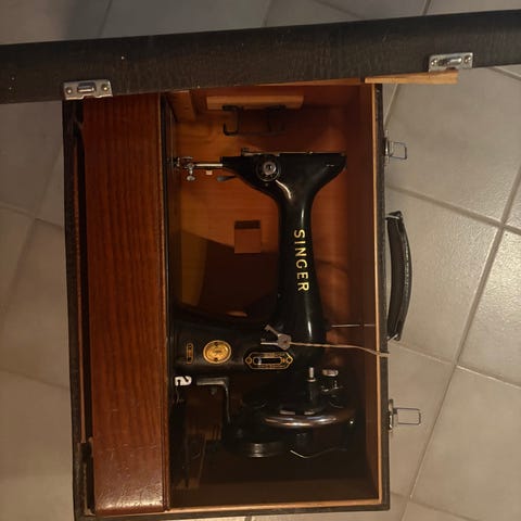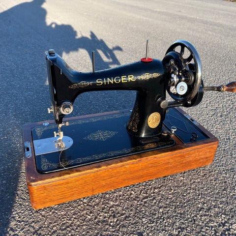 KING mærke håndsymaskine i lyseblå metaludførelse med træbund. Maskinen betjenes med håndsving og har kromdetaljer omkring hjul og nåleplade. På siden ses en krone-dekal samt justering til stinglængde. Egnet til almindeligt syning af stof og som dekorativ eller samlergenstand. Leveres monteret på træplade, som fungerer som base under brug.
