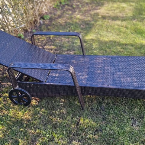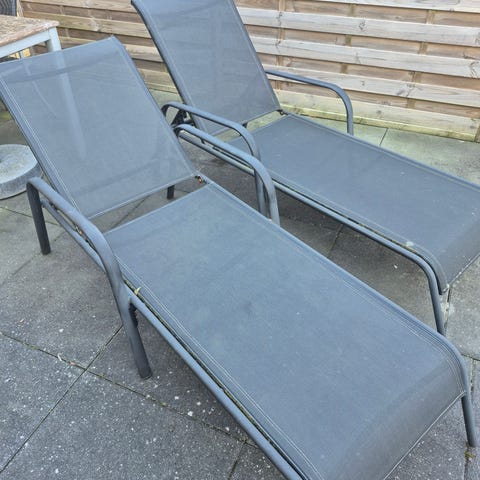 Solvogn sæt i hvid flet med hjul. Sættet består af to solvogne med justerbar ryg og armlæn. Stel i metal og liggeflader i flettet hvid plast materiale. Solvognene er udstyret med hjul bagtil, så de er lette at flytte rundt på terrasse eller i have. Velegnet til udendørs brug på altan, terrasse eller i haven. Se stand på billeder, der mangler blandt andet gummi omkring det ene hjul. De fejler intet og kan sagtens bruges i et sommerhus eller lignende. Vi bruger dem ikke nok….