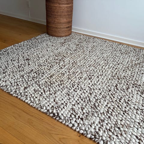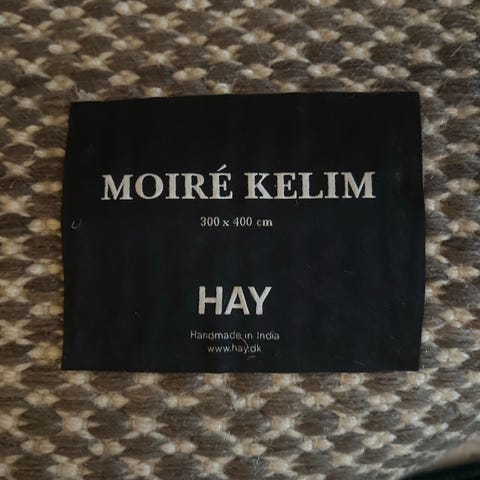 Hay Moiré Kelim tæppe i brun/beige mønstret vævning. Rektangulær form, egnet til brug i stue, soveværelse eller entré. Tekstil-tæppe med flad vævning, som ligger godt på et fast underlag. Neutrale farver, der passer ind i mange indretninger.