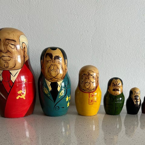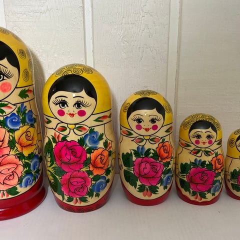Træ babushka dukker sæt i flerfarvede nuancer. Sættet består af flere dukker, der kan placeres indeni hinanden, fra en større yderdukke til meget små inderdukker. Dekoreret med blomster- og mønsterdetaljer på krop og hovedtørklæde. Velegnet som dekoration eller samlerobjekt. Købt i Rusland i en gang i 90’erne.