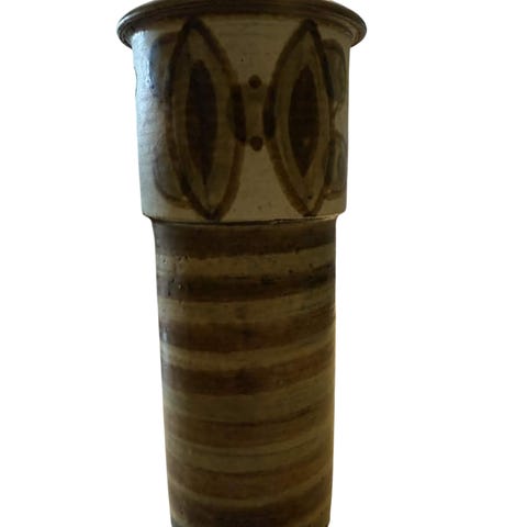 Søholm keramik lille vase i hvidt porcelæn. Vasen har rund form med smal hals og dekoration i form af en stiliseret blomst eller bladmotiv omkring midten. Undersiden er mærket med serienummer. Velegnet som enkeltstående pyntegenstand eller til små blomster og grene på bord, hylde eller vindueskarm. H 10,5 cm dia 7 cm.