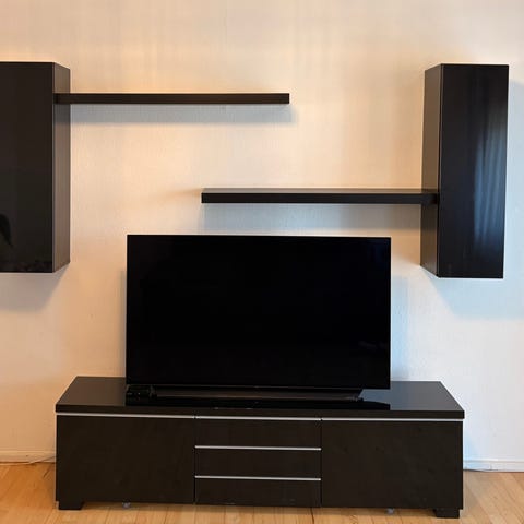 IKEA tv-bord i hvid. Møblet har skabsrum med hylder bag låger, som giver plads til opbevaring af fx elektronik, spil eller andre ting i stuen. Kan bruges som lavt skænk- eller mediemøbel og kan enten stå på gulvet eller monteres på væg afhængigt af beslag og montering (ikke vist). Velegnet til brug under væghængt tv eller som opbevaringsmøbel i stue eller værelse. Hele vægreolen er en sektion 180 cm og en anden sektion 120 cm samt 2 glasskabe 40x40