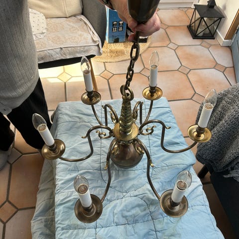 Virkelig flot 6-armet lysekrone. Kan anvendes både med og uden lampeskærme.