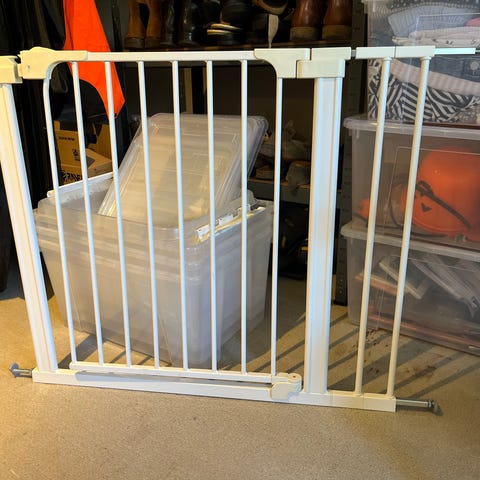 Sikkerhedsgitter i hvidlakeret metal. Monteres i døråbning eller mellem to vægge med justerbare spændebeslag i siderne. Gitteret har lodrette tremmer og åbnes med håndtag øverst. Velegnet som børnegitter eller husdyrgitter til afskærmning af bestemte rum eller områder i boligen.