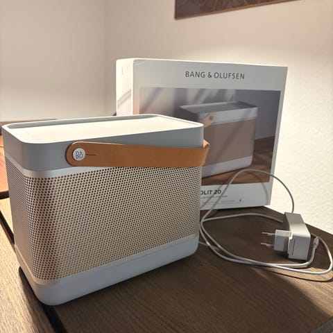 Bang & Olufsen Beolit højttaler i hvidt design med bærestrop. Højttaleren har betjeningsknapper på toppen samt tilslutningsmuligheder på bagsiden. Kan benyttes via strømtilslutning eller Bluetooth.