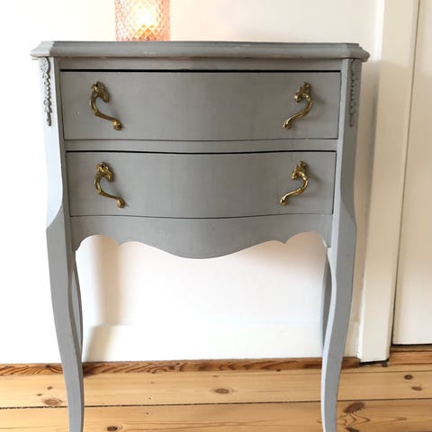 Kommoden står på metal ben.