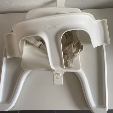 Stokke børnestol babyindsats med sele i grå tekstil. Indsatsen har blød polstring og integreret sikkerhedssele. Undersiden er i hård plast med struktur for stabil placering på stolen. Velegnet som ekstra indsats til Stokke børnestol til mindre børn, der har brug for støtte og fastspænding ved bordet.