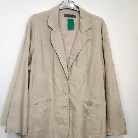 Den er enkel i snittet med revers, åben ned foran og lange ærmer.