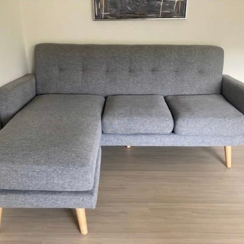 Stor sofa med aftagelig puff. Stoffet er fløjl