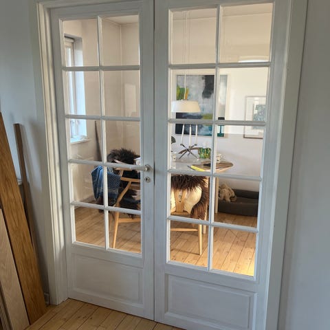 Flot dobbeltdør med glasfelter i hvidmalet træ. Den vejer godt til.
