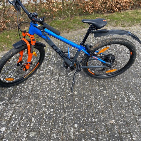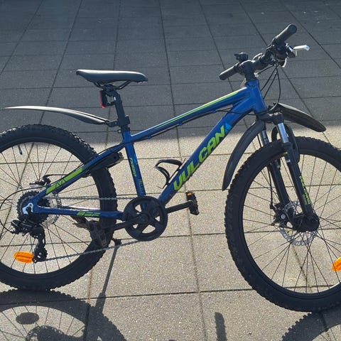 Fin cykel med aluminium-stel, støttefod, skærme, lås og to lygter der lyser automatisk når hjulene drejer.