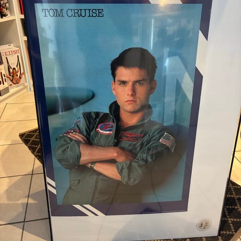 Top Gun filmplakat. Plakaten viser motiv fra filmen med titel og hovedfigurer samt grafiske elementer fra filmens univers. Egnet til ophæng i f.eks. stue, kontor eller hjemmebiograf. Materiale og størrelse fremgår ikke tydeligt af billederne.