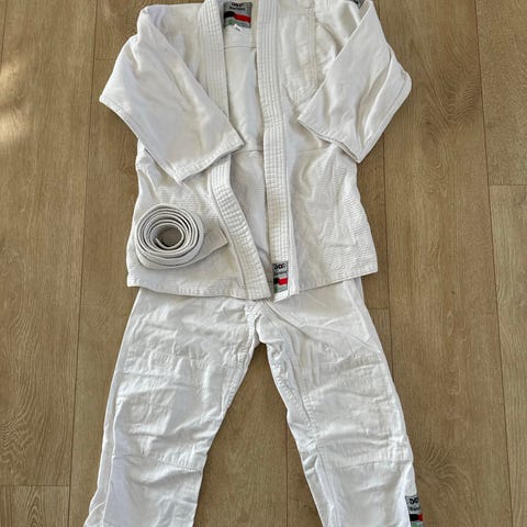 Dax Bambini kampsportsdragt i hvid i børnestørrelse 152. Dragten består af jakke med vævet revers og bukser med elastiklinning og snøre. På jakken er der et rundt klub- eller stilartsmærke på brystet. Sættet er egnet til forskellige former for kampsportstræning for børn, f.eks. judo eller lignende discipliner. Materialet er vævet stof, typisk bomuldsblanding, der er velegnet til bevægelse og grebstræning.