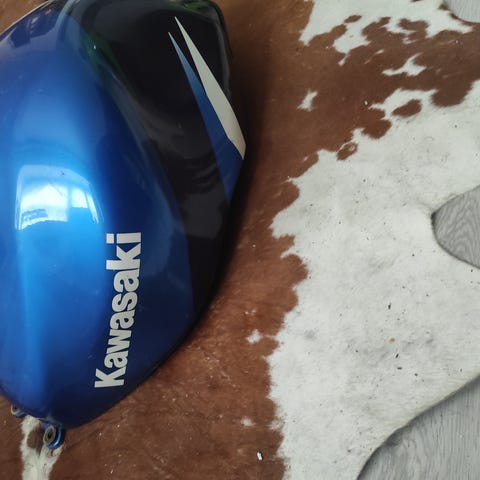 Benzintanken på billedet stammer fra en Kawasaki motorcykel. Den blå farve og grafikken er karakteristisk for flere modeller fra slutningen af 90'erne og starten af 00'erne.