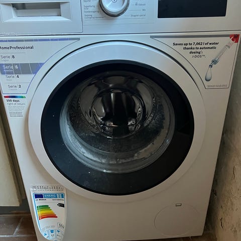 Bosch vaskemaskine, frontbetjent model i hvid. Maskinen har frontbetjent luge med gennemsigtigt vindue og rustfri tromle. Betjeningspanelet består af drejeknap til valg af programmer samt digitalt display og knapper til indstillinger. Programvælgeren omfatter blandt andet programmer til allergi, skjorter, sport, uld, finvask, bomuld, syntetisk, hurtigprogram og øko-programmer. Velegnet til almindelig husholdningsvask. Maskinen tilsluttes som standard vaskemaskine med vandtilførsel, afløb og strømtilslutning på bagsiden. Hentes hurtigst mulig i Charlottenlund