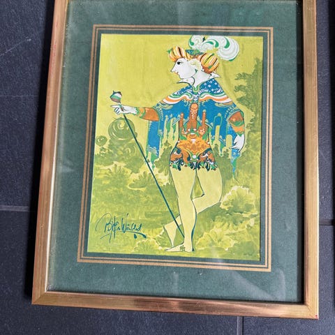Trykket er indrammet i en ældre dekorativ ramme, som giver billedet et flot retro og klassisk udtryk. Perfekt til retro indretning, samlere af Wiinblad eller som dekorativt vægbillede.