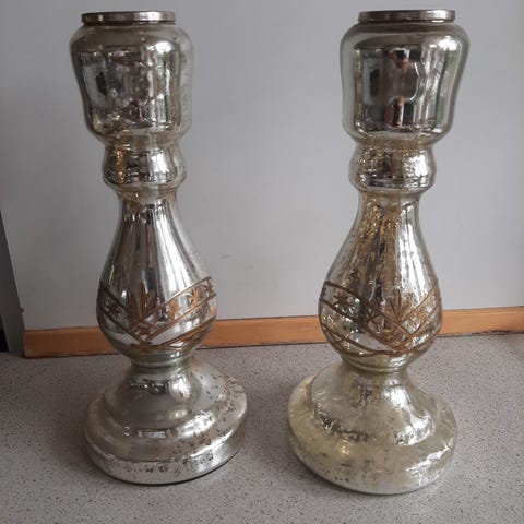 Tre lysestager, to til fyrfadslys i mørkt glas, en lavet af elektrisk isolationsdims til stearinlys. Samlet pris: