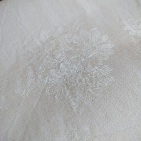 Smuk antik hvid hørdug med håndbroderet monogram. Damaskvævet med blomstermotiver. Dugen er nøje gennemgået, vasket, strøget og fejlfri.