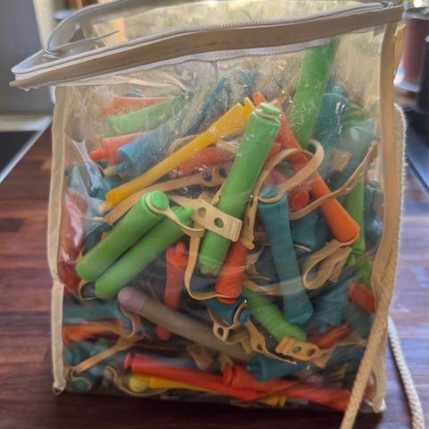 Sælger en stor pose med frisørudstyr til permanent (krøller).