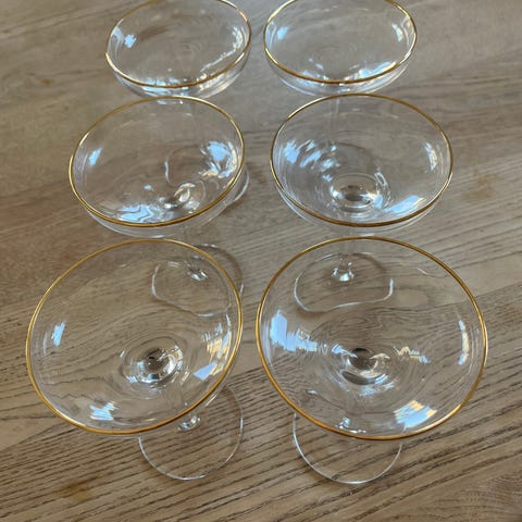 6 vintage glas til dessertvin eller spiritus med guldkant. Sælger også 6 matchende Champagneskåle, se anden annonce.
