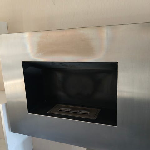 Væghængt biopejs i sort metal. Rektangulært design med indbygget brænder i bunden af kammeret. Fronten har en mat, let struktureret overflade. Pejsen er beregnet til montering på væg og anvendes med bioethanol som brændsel. Velegnet som dekorativ varmekilde i opholdsrum, hvor der ønskes åben flamme uden skorsten.