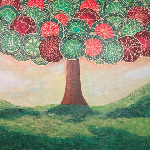 et farverigt og stiliseret maleri, der kombinerer naturens form med en legende og moderne æstetik. Træets krone opbygget i jordtoner, som skaber en følelse af dybde, ro og nysgerrighed.
