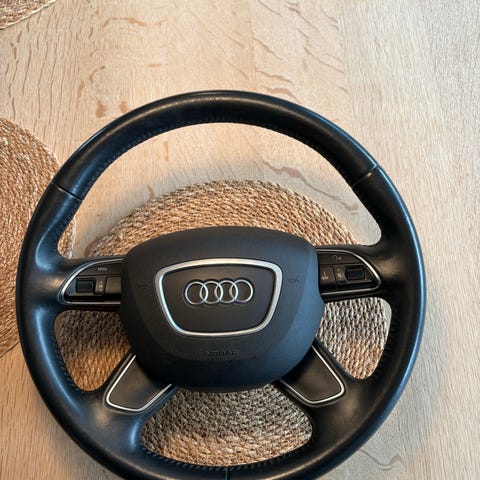 Originalt audi a5 Rat med multifunktionsknapper i sort læder. Der er paddleshifts på og rattet har kørt ca 60.000km… i rigtig god stand ingen dybe ridser eller mærker. Sælges uden airbag :)