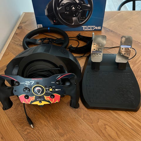 Thrustmaster T300 med pedaler og flere rat. Pedalerne er opgraderet med "hall sensors" men har ikke brugt dem efter opgraderingen. Det originale hardware medfølger hvis man vil tilbage til det gamle system med potentiometer.