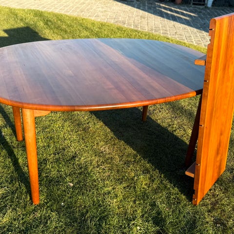 Bordet er fra 1986 i sort højglanslakeret træ. Sammentrukket er bordet 150 cm langt, men der medfølger 2 tillægplader a 55 cm, så bordet kan være hhv 150/205/260 cm langt. Bredden er 100 cm. Efter 40 års brug er der nogle mærker og afskalninger, men generelt er bordet i god stand. Bordet kan nemt skilles, så det kan transporteres og nemt bæres op ad trapper.