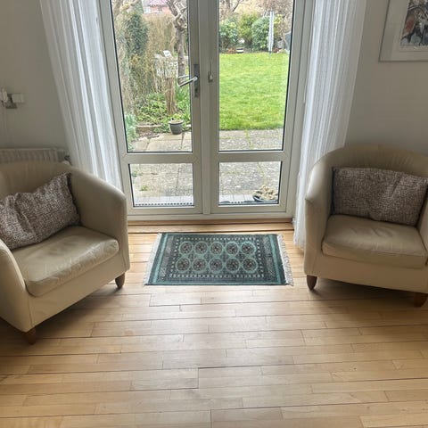 To hvide lænestole med olieret kirsebærtræ. Skal have nye "frakker" som monteres med velcrobånd. Ellers i fin stand. Sælges for 1000 kroner per styk.