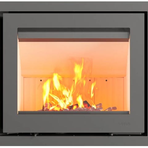 Indbygget brændeovn med glaslåge samt glas i venstre side. Velegnet til integreret brændeovnsløsning i eksisterende murværk eller skorsten.